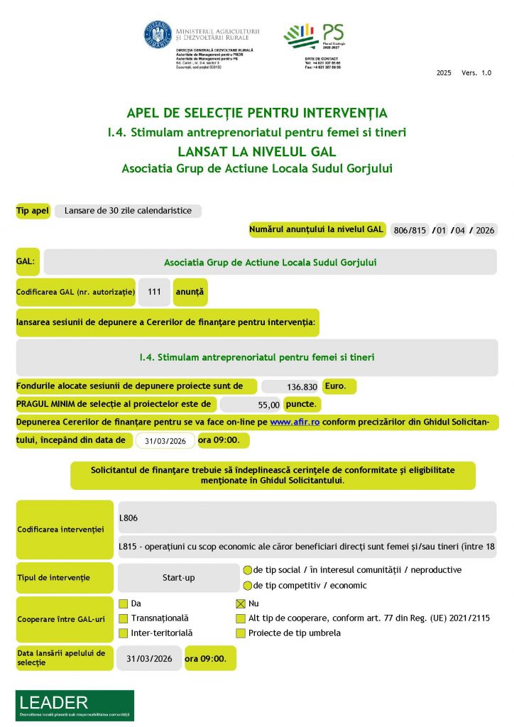 Home Anunț lansare apel de selecție – I.4. Stimulam antreprenoriatul pentru femei si tineri gal 11 martie 2026 ← Anunt lansare apel de selectie – I.2. CULTURA REDIVIVUS